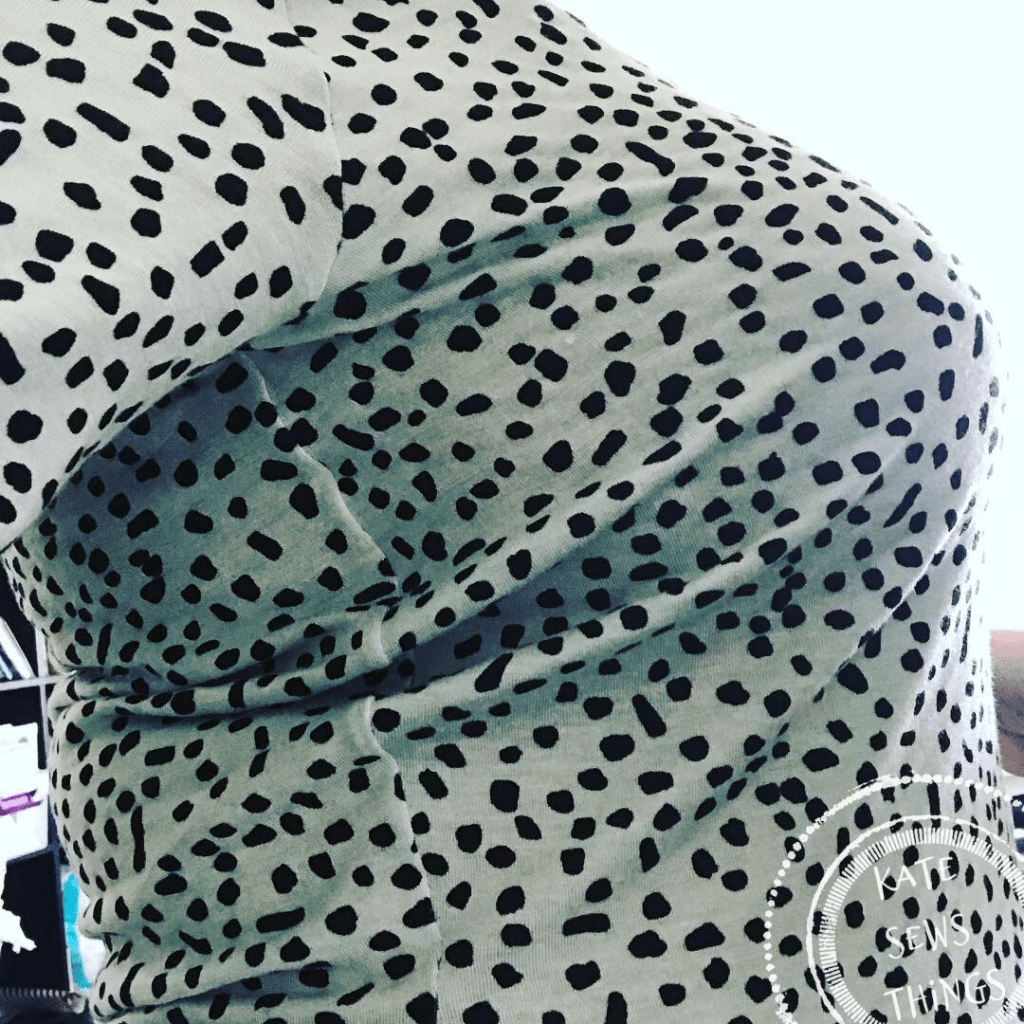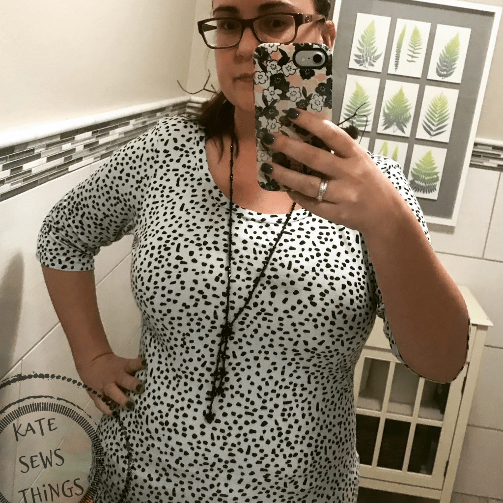 I chose a mint jersey fabric with black “chips” I had in my stash, from Girl Charlee back when they did the original Knit Fix. I have in my notes that it is a rayon spandex, and it is much lighter weight than the Cashmerette kit fabric is, but I figured it would work ok. I have a bad habit of buying the EXACT weight and drape fabric for a muslin, even knowing it may not work out. Maybe this is why I hate making muslins and think it is a waste! So, part of my goal for 2019 was to sew from my stash, and “make do.”