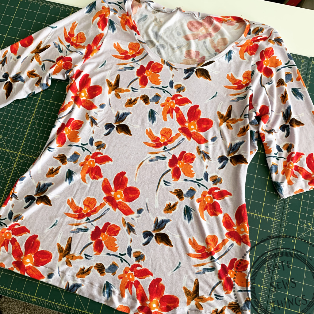 I ended up getting some inexpensive rayon spandex fabric at Joann in a purple floral print that is a little heavier than the Girl Charlee I first used. It is so soft and comfy to wear, but I cut the straight size 12 again instead of trying to mess with the shoulder for now. By the end of the day it is a little baggy in the shoulder and sleeve area.