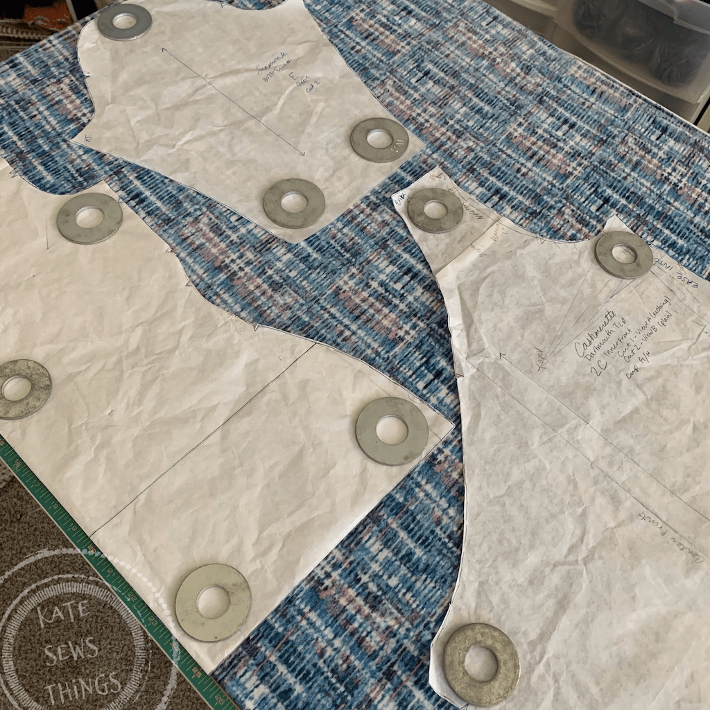 When I went to check my measurements to see what size I should use, going off my upper bust measurement of 34″, that put me into a size XS. I literally had the thought “well, no wonder the size 12 isn’t working there.” I used the Erica to trace yet another set of lines on my Dartmouth pattern pieces, both the front and the back. I left the 1″ removed from the length of the upper bust area and just traced right over that. The angle of the shoulders of the Erica was different, but compared better to my moulage shoulder angle than the Dartmouth did, which could have been part of the problem as well. On the back, the Erica has the shoulder out wider than the Dartmouth does, but at this point, I decided to trace and cut as is, which required adding some tissue paper to the shoulder area of the back.