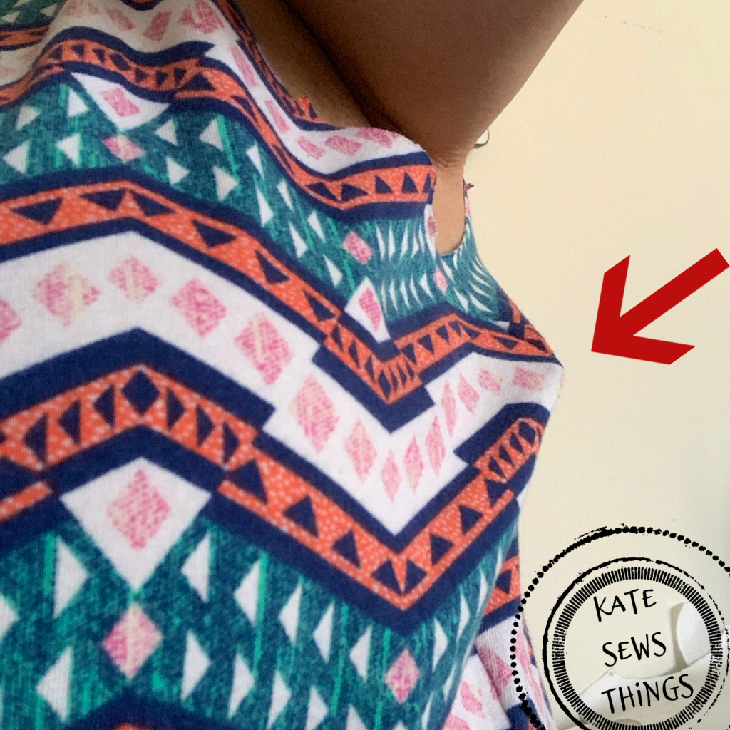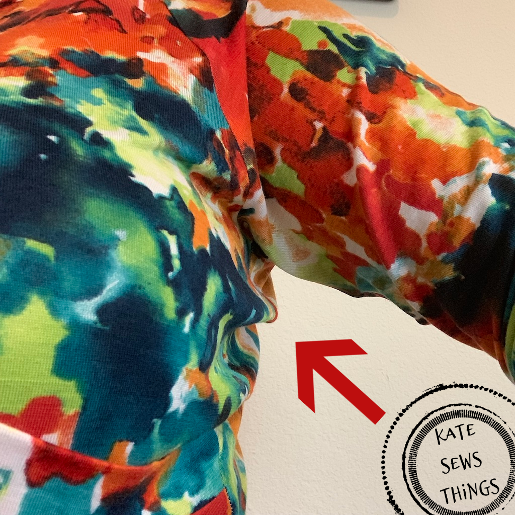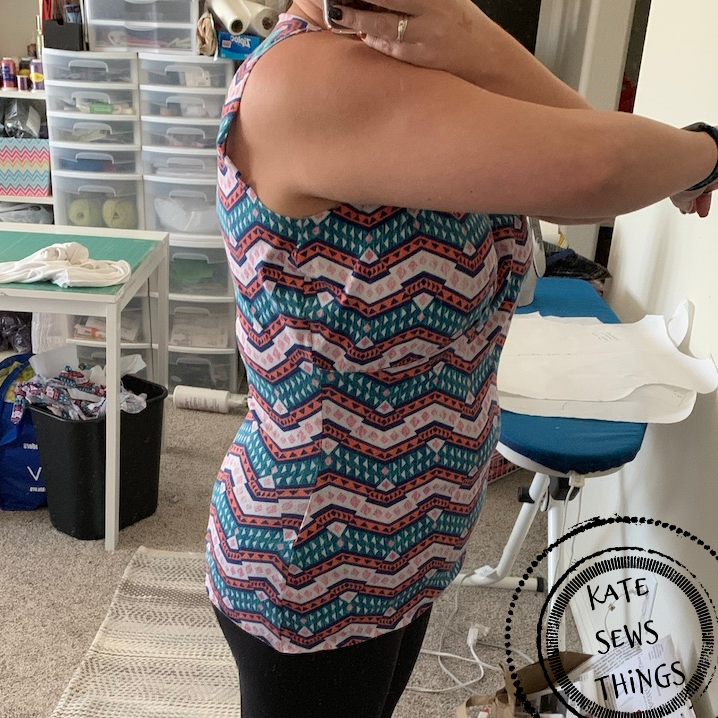 I used the remnant of tribalesque fabric to do a muslin of just the body, the front two pieces and the back piece, and was able to see another problem right away, with extra fabric directly below my underarm area. It took some thinking through to figure out the issue. I posted some pictures on a few Facebook groups asking for advice, and the prevailing thought was if I attached the arms, things would be fine. However, this is something that has come up with the Concord as well, though due to fabric choices when making that pattern it was not as noticeable as this was.