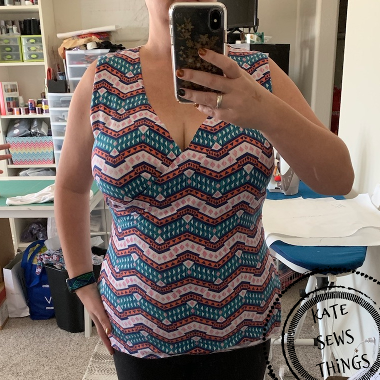 For my ultimate Dartmouth top, I used the blue print rayon/spandex, with no additional changes. The under bust area lays perfectly, and the shoulder points hit at my actual shoulder point. There isn’t a bunch of extra fabric or bunching above my bust, either. I absolutely love it. The fabric is so comfortable, the wrap lays beautifully, and even working at a school, with constant movement and bending, I never need to wear a camisole for modesty.