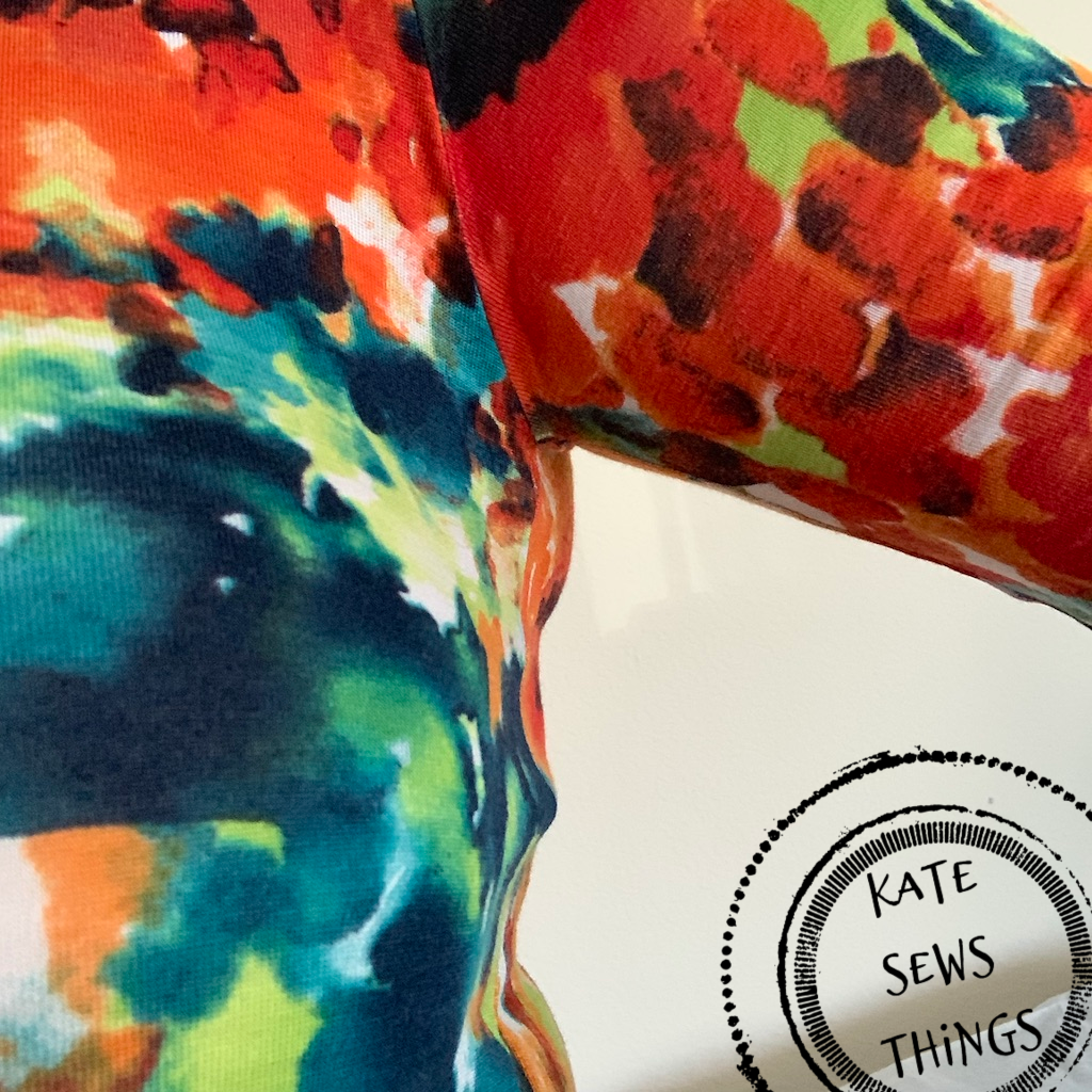 I had previously purchased two separate kits from Cashmerette, one with a blue print rayon/spandex, and the other a fuschia plaid poly blend. To make muslins, I found a crazy orange-based print in rayon/spandex that I had received back with the company Girl Charlee would do their “knit fix” boxes, as well as some left-over tribalesque rayon/spandex.