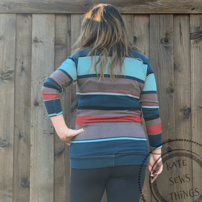 All-in-all, I like it, and I like how much the neck band bunches up around the back of my neck. It is like wearing a scarf without actually having one on and having to deal with it. It does unroll itself in the front a bit like the above picture, which creates a more straight line going from my neck/shoulder across to under my bust. I don’t think adding more space into the bust area would fix this, though, and it would honestly create a different look than the line drawings. I do like how the striped fabric has varying sizes of stripes, because that makes it more difficult to tell when wearing exactly what the look for sure should be. I might attempt a sway back adjustment next time, though I have never done that before. I know I need one, but usually I am so focused on getting the bust to fit, I tend to ignore other fit problems.