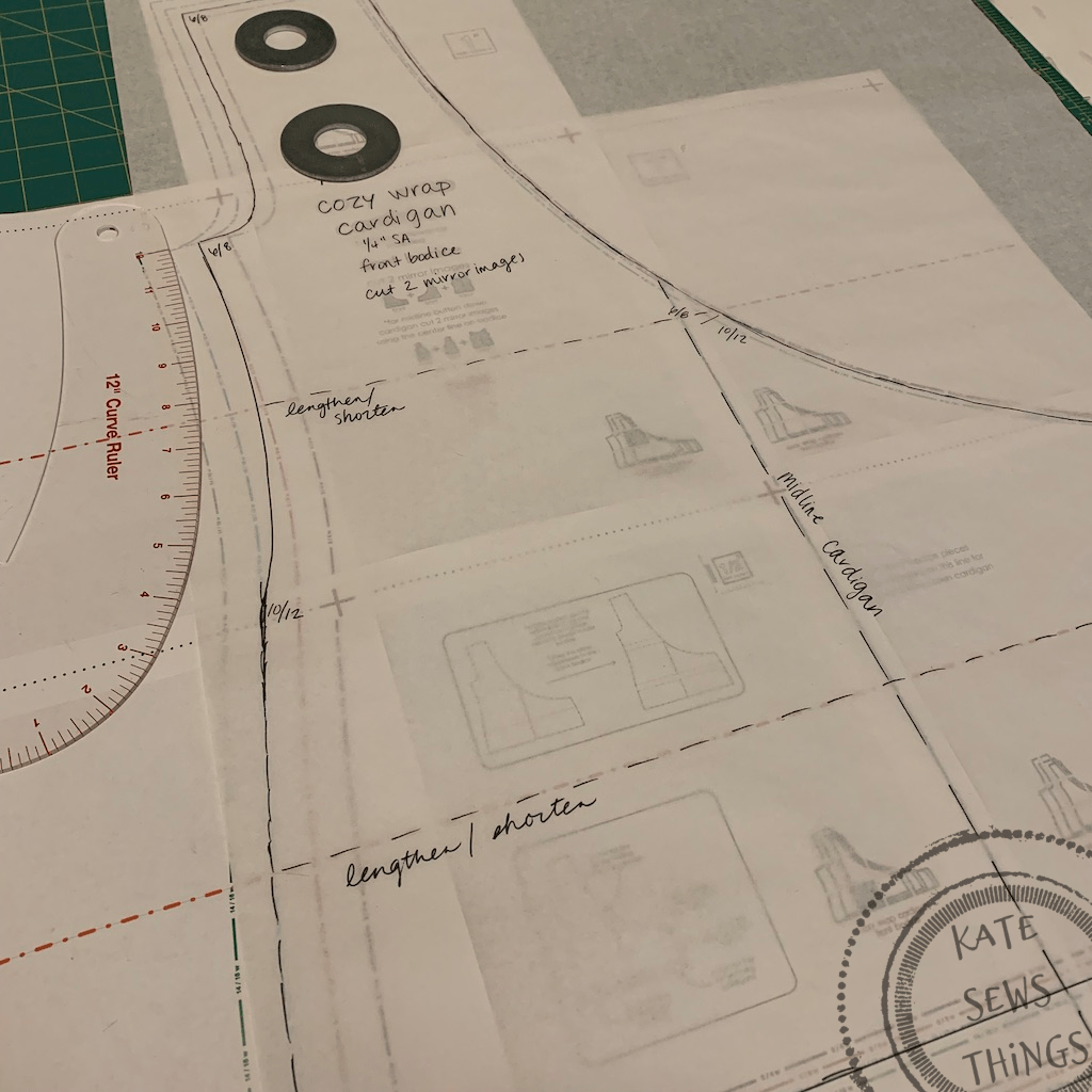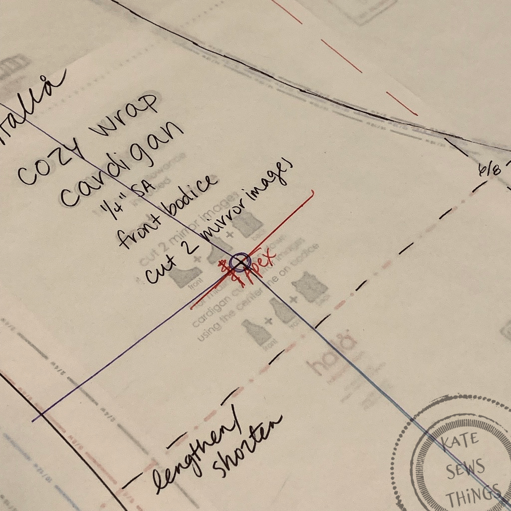 Did a FBA of 3cm directly at the apex on the bust line, and closed up the excess width added to the waist/hip area. I also added clear elastic at the shoulder seam, to help support the sweater knit fabric.