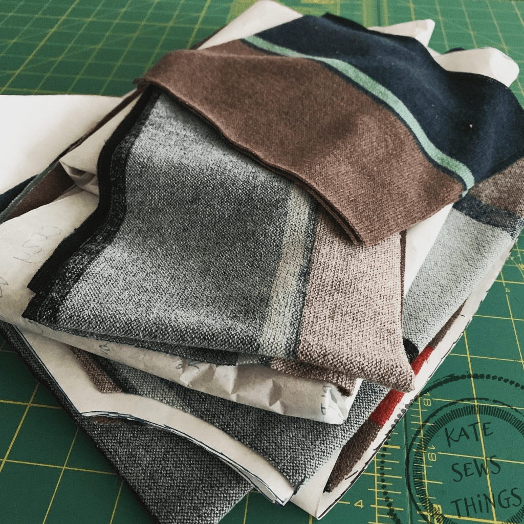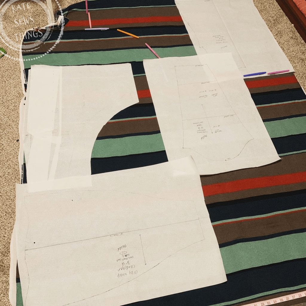 Since this technically would be a muslin, though I definitely hoped it would be wearable by participating in the hands-on sew along process, I grabbed some sweater knit fabric that I had gotten from a So Sew English bundle when they were having a sale. I really liked the colors, but being a polyester fabric, it wasn’t my favorite. It is striped, and coming in just a 2 yard cut, I had my work cut out for me to fit all the pattern pieces in a way that the stripes matched. Since I started sewing for myself, I am fairly obsessive about stripe matching. The pattern calls for 2 yards for the cross front sweater view, PLUS .66 yard for the waist band. I actually laid the entire piece of fabric flat, then lay out all the pattern pieces on top. I also got creative to show where some of my mirrored pieces would be.