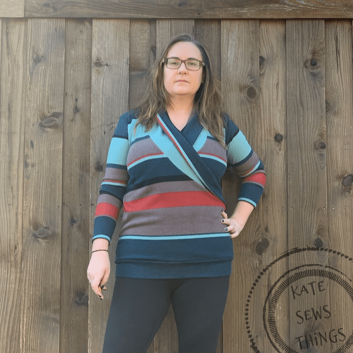 The Cozy Wrap Cardigan pattern is a bit of a misnomer here because I did not actually choose to sew the cardigan view. Instead I chose the “Cross Front Sweater” view, which uses all the same pieces, except the bands are crossed at the front and then attached into the side seams. Having just finished my Cashmerette Dartmouth wrap top, I was really drawn to this similar wrap style look.